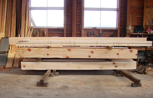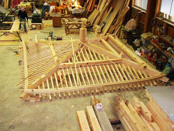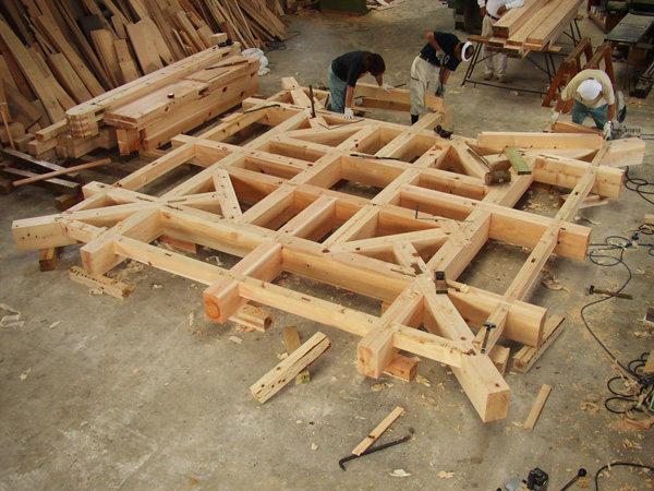 その後、一旦ばらしてから現場に運び再び組み立てます。 工場内で仮組みをすることができるため 本建築の前に全体の雰囲気をつかむことが容易になり 細かい細工と全体の構造物のバランスも見ることができます。 また工場内でカット、乾燥、加工までさせるため、 途中で雨に当たったりすることもありません。 それにより、狂いの少ない材料で建築することができます。