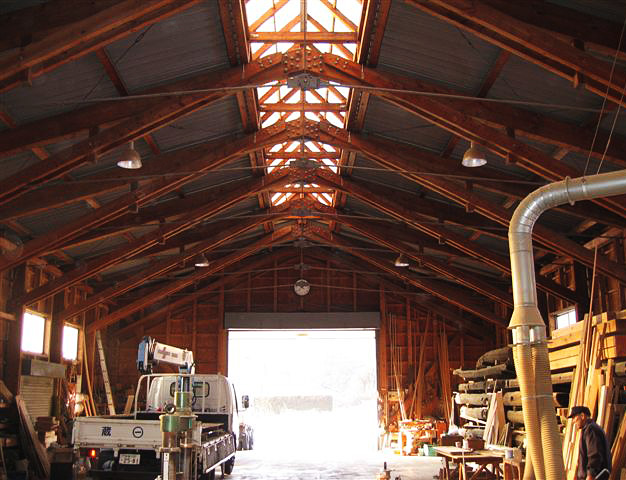 渋谷建設では約450㎡の自社工場を持っています。 材木をここで必要な大きさにカットし、乾燥させ、刻みや彫り、 磨きを加えていきます。 当社工場は木造洋小屋組で建築しております。 工場内には柱はありません そのため、神社や山門の屋根組みなど、大きくて複雑な構造物も 自社工場内にて仮組みをし、細かい調整を行うことが可能です。